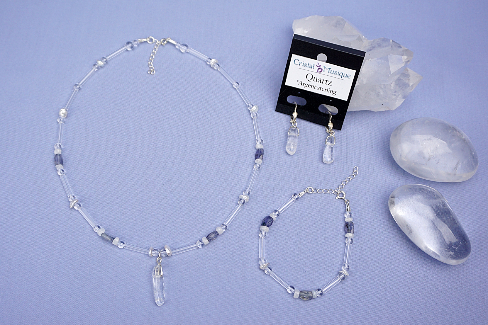 The jewels are composed of pure quartz crystal tubes (like the notes of our crystal xylophone), polished or faceted crystals (several choices according to the combinations) as well as freshwater pearls. In addition, they are hypoallergenic, because the metals (all fasteners and adjustments) are made of sterling silver, as much for earrings as necklaces as well as bracelets.