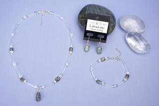 - Labradorite, freshwater pearl, quartz crystal, moonstone